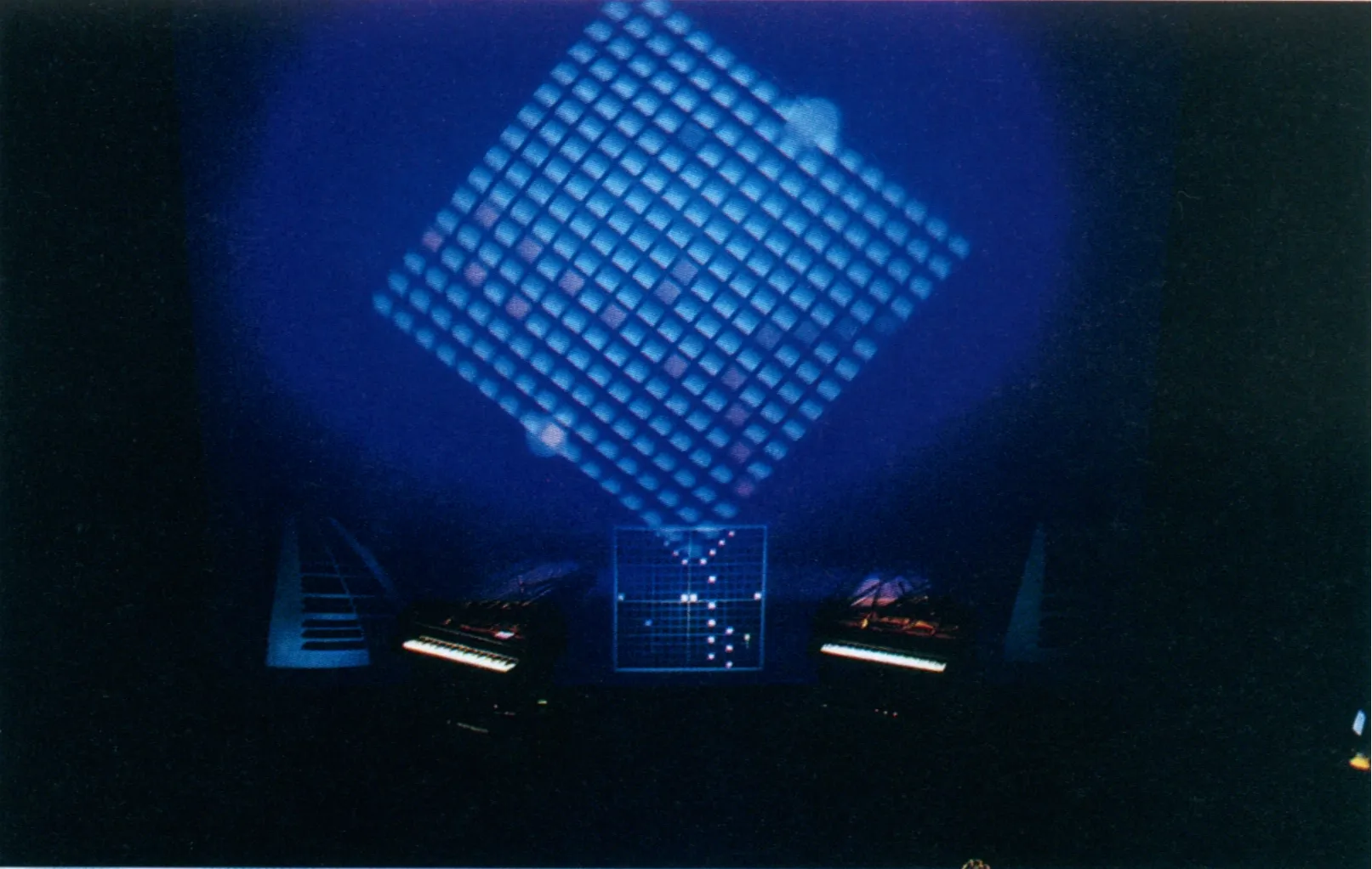 基本的な仕掛けは、岩井俊雄によって映像スクリーンと連動させられたMIDIピアノを坂本龍一が弾くというものだ。その原型となる岩井俊雄の《映像装置としてのピアノ》については本誌16号ですでに紹介したが、あらためて簡単に説明しておこう。ピアノをMIDIによってコンピュータとつないでおけば、ピアノを弾くことでコンピュータに信号を送ることもできるし、コンピュータからの信号でピアノを弾くこともできる。その信号からリアル・タイムで映像を生成することによって、キーを叩くとそこから光の点が立ち上がるとか、逆に光の点が落ちてくるとその真下のキーが鳴るとかいったイリュージョンを生み出すことができるというわけだ。音楽が映像を奏で、映像が音楽を奏でる。文字通り〈Music plays images, images play music〉と銘打った水戸でのパフォーマンスは、この単純な仕掛けを魔術師のように変幻自在に使いこなしてみせる、きわめて意欲的な試みだった。