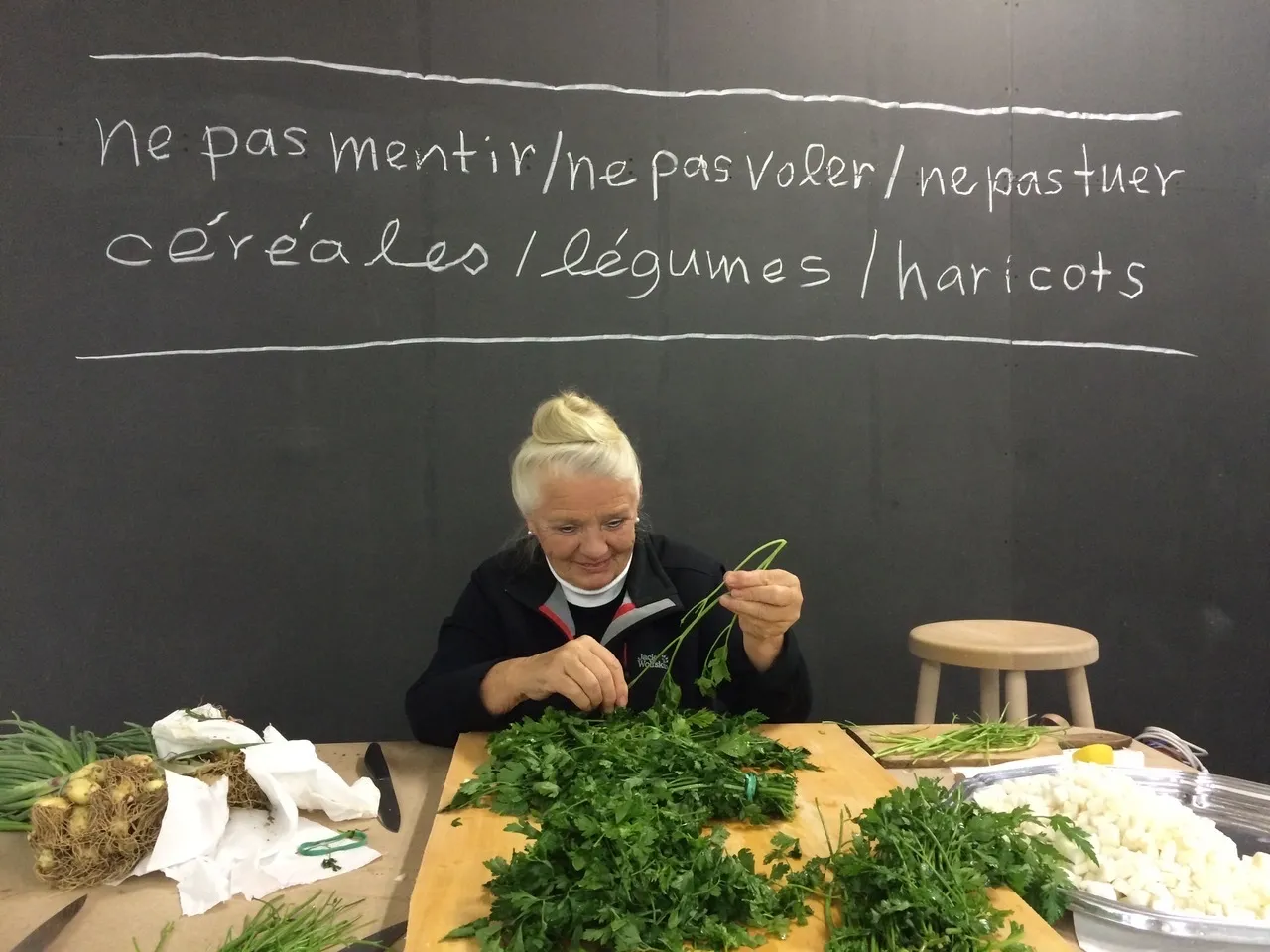 - ラウリンとエゴン・ハンフシュテングルによるフード・イベントの写真(7月13日告知ページより)。黒板にはラウリンの文字で、「嘘をつくな、盗むな、殺すな/穀物、野菜、豆」とある。©Eric Giraudet de Boudemange